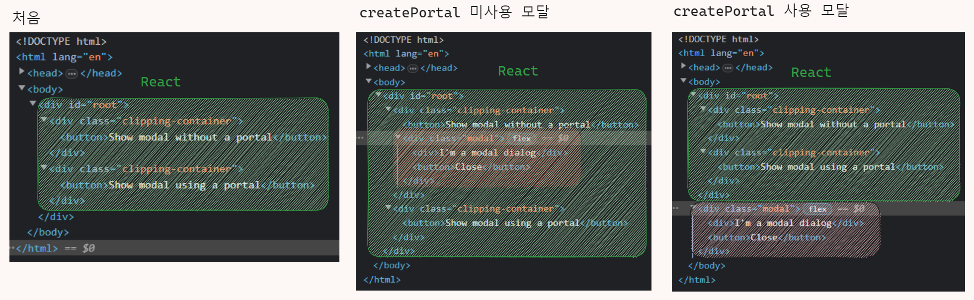 ✅일부 JSX 조각을 React Root가 아닌 DOM의 일부분으로 렌더링할 때 사용