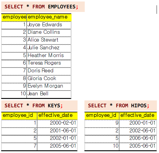 KEYS 테이블의 employee_id와 HIPOS 테이블의 employee_id를 INTERSECT한다.
