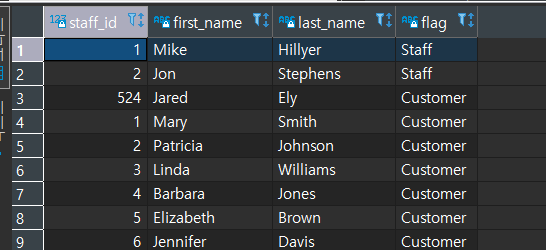 SELECT s.staff_id, s.first_name, s.last_name, 'Staff' AS flag