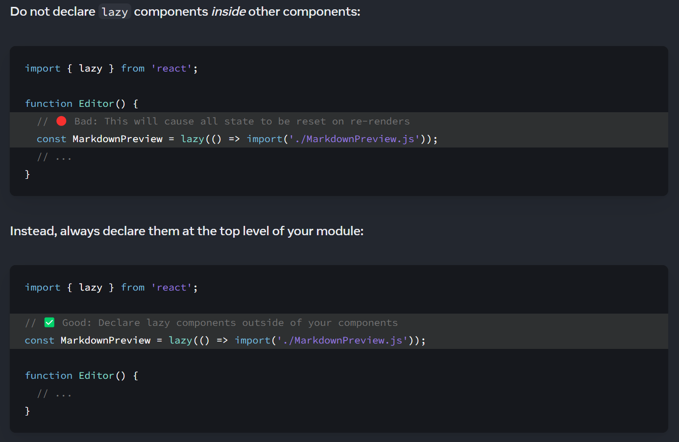 ⭐lazy components는 컴포넌트 바깥에서 선언해야 한다